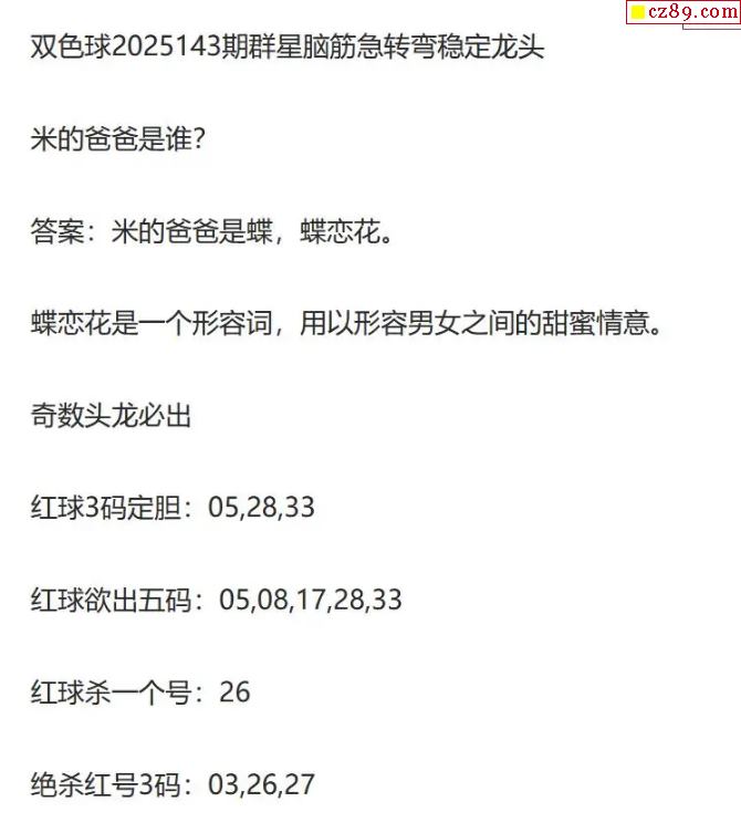 > 25年福彩双色球143期 群星脑筋急转弯定龙头字谜